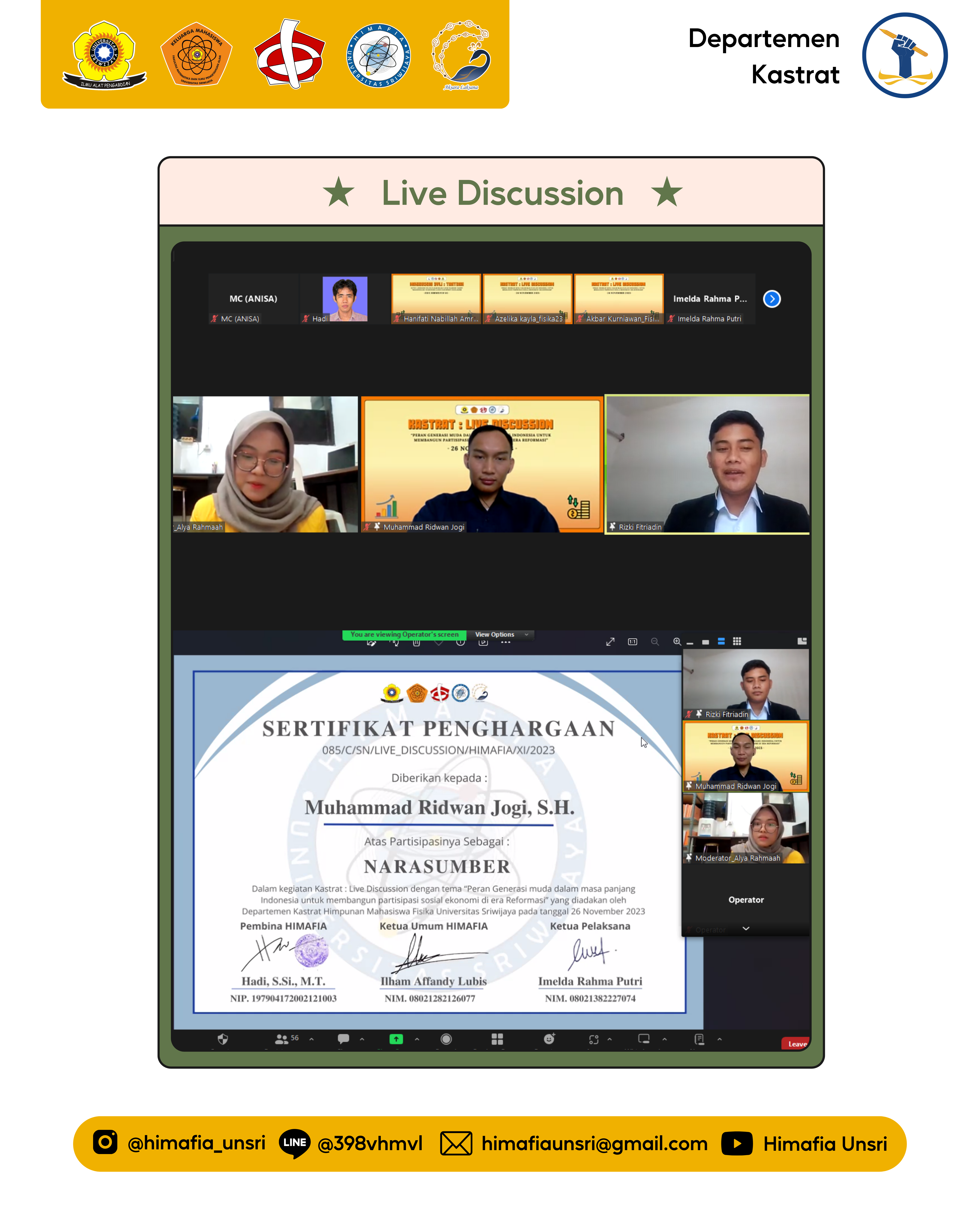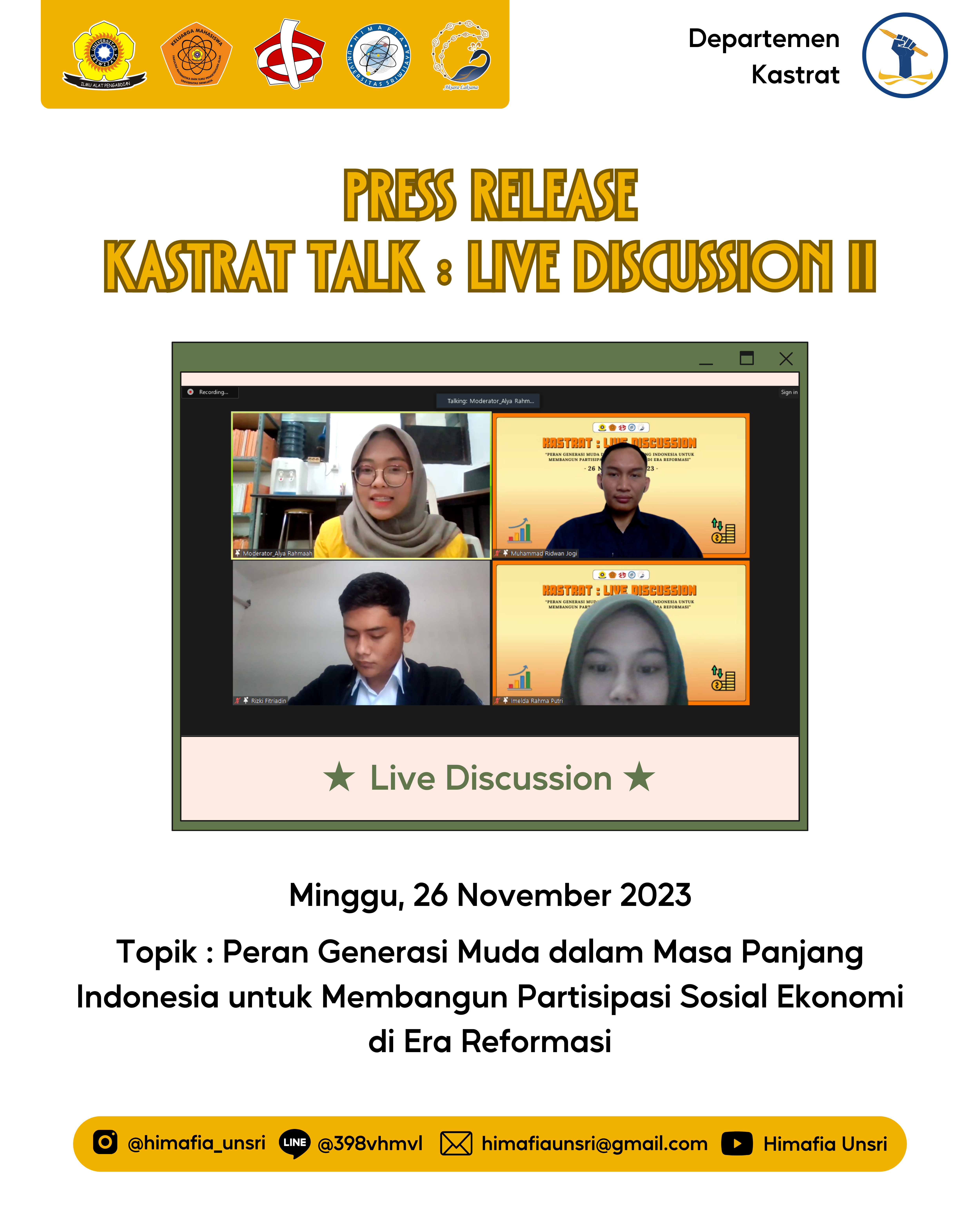Terimakasih kepada semua yang telah berpartisipasi untuk menyukseskan acara Kastrat Talk : Live Discussion II yang bertemakan “Peran Generasi Muda dalam Masa Panjang Indonesia untuk Membangun Partisipasi Sosial Ekonomi di Era Reformasi ”