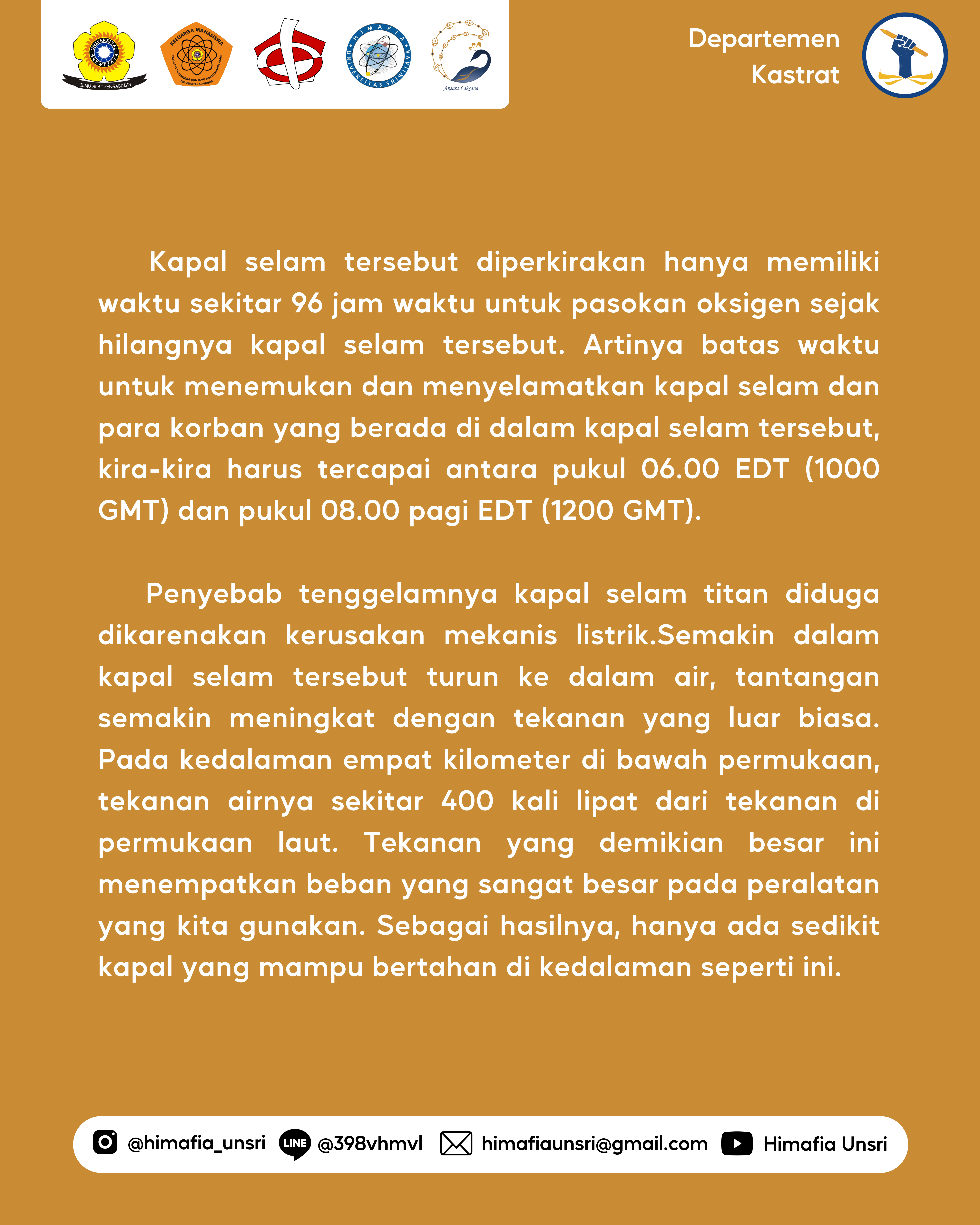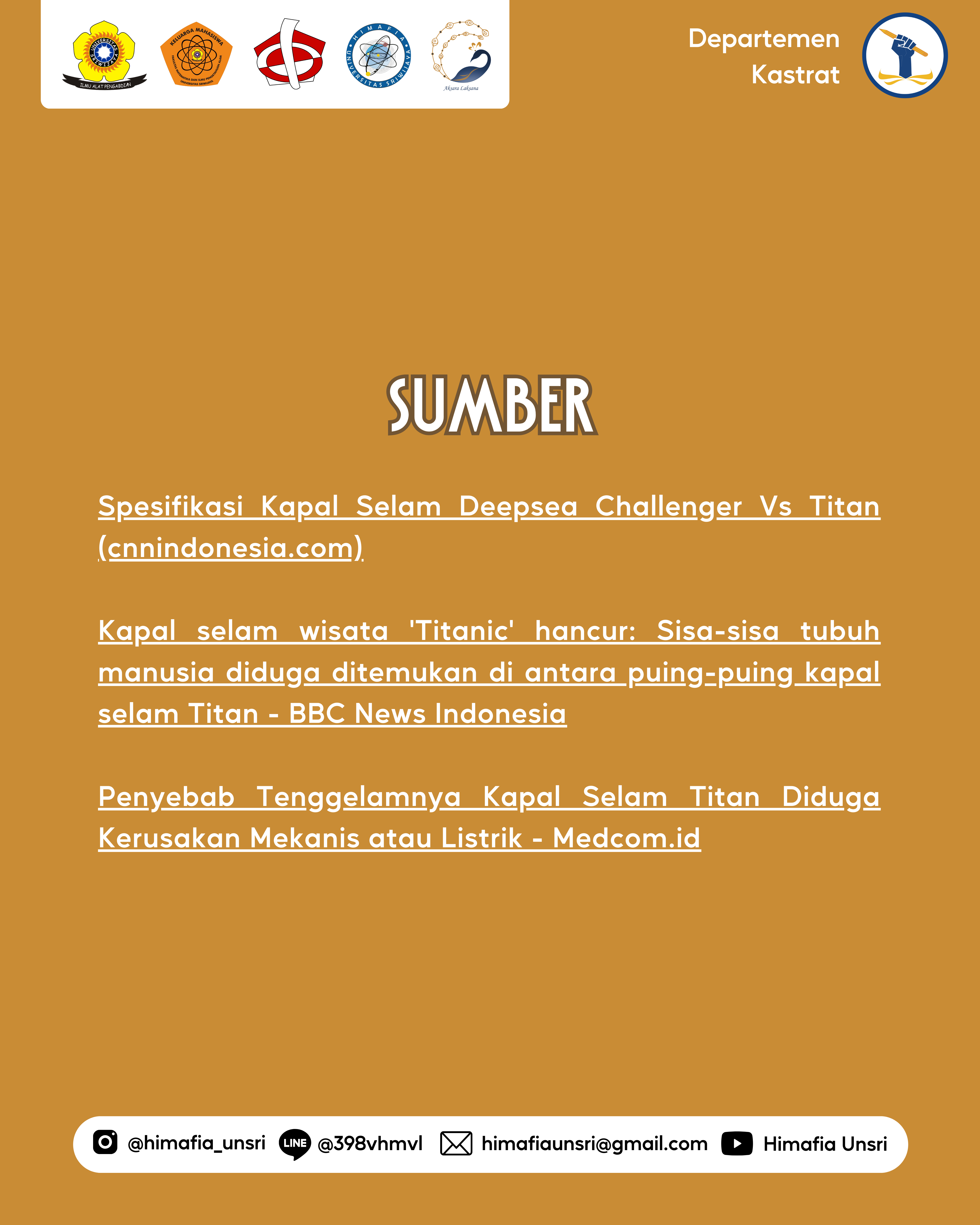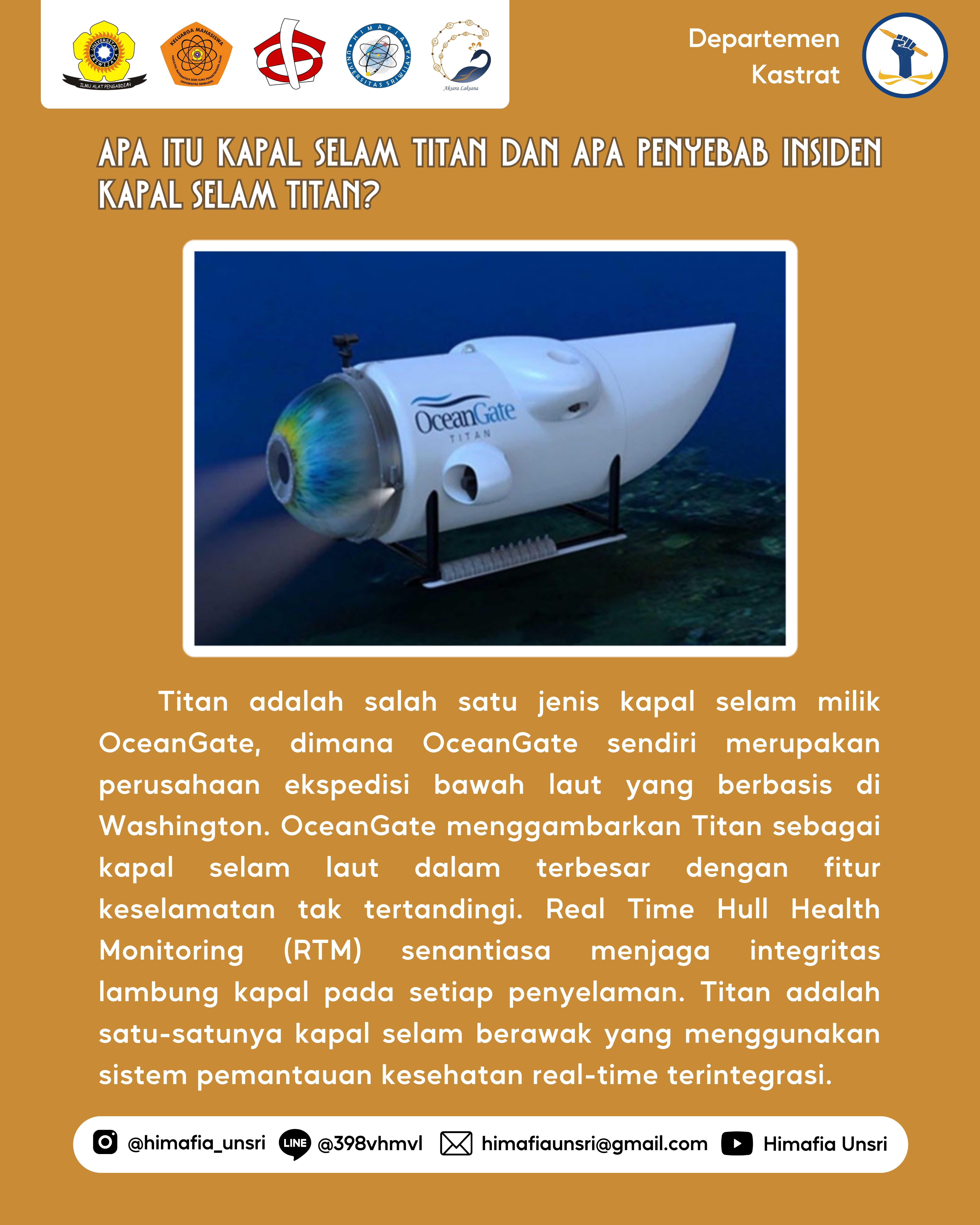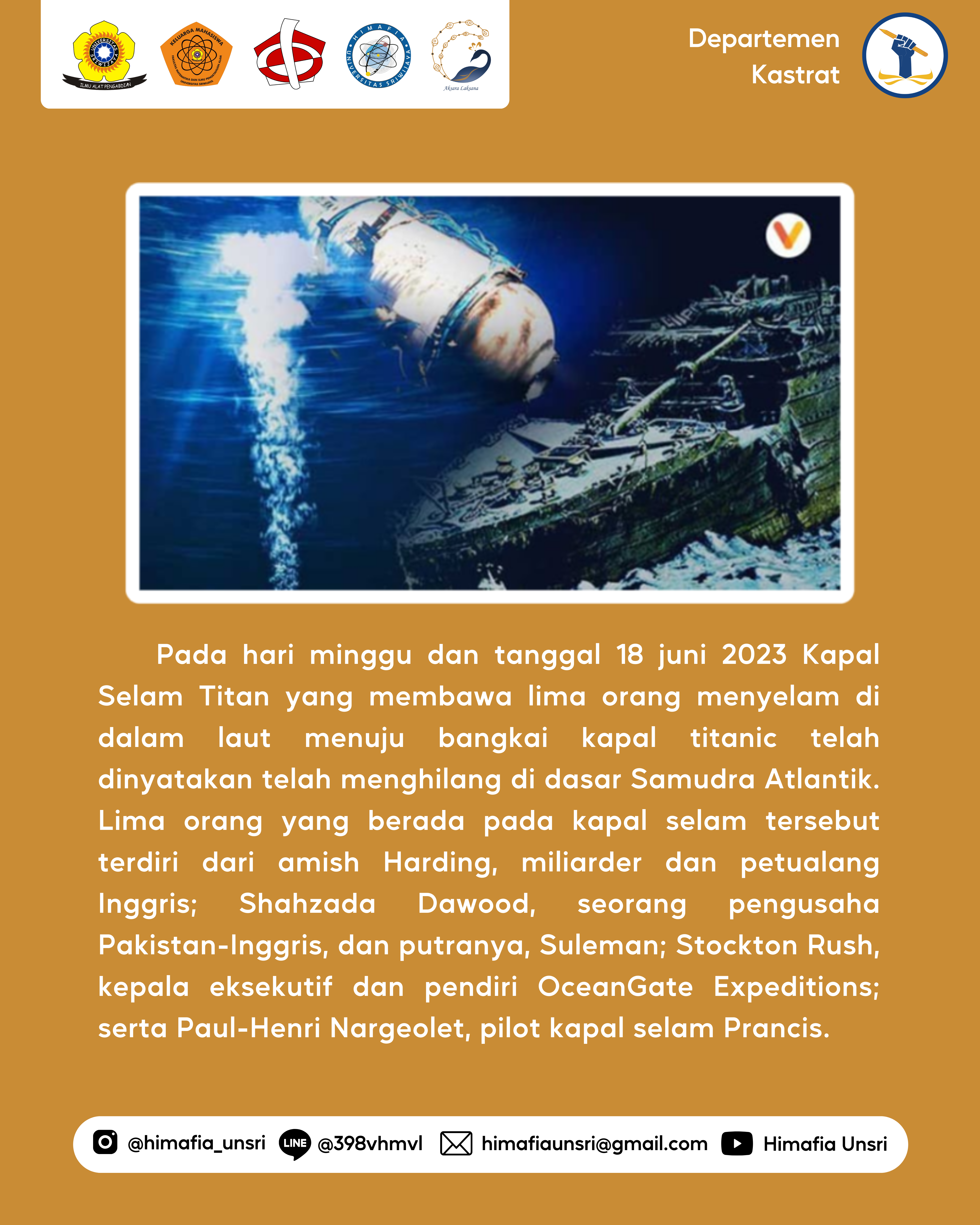 Kapal Selam Titan yang membawa lima orang menyelam di dalam laut menuju bangkai kapal titanic telah dinyatakan telah menghilang di dasar Samudra Atlantik. Lima orang yang berada pada kapal selam tersebut terdiri dari amish Harding, miliarder dan petualang Inggris; Shahzada Dawood, seorang pengusaha Pakistan-Inggris, dan putranya, Suleman; Stockton Rush, kepala eksekutif dan pendiri OceanGate Expeditions; serta Paul-Henri Nargeolet, pilot kapal selam Prancis.