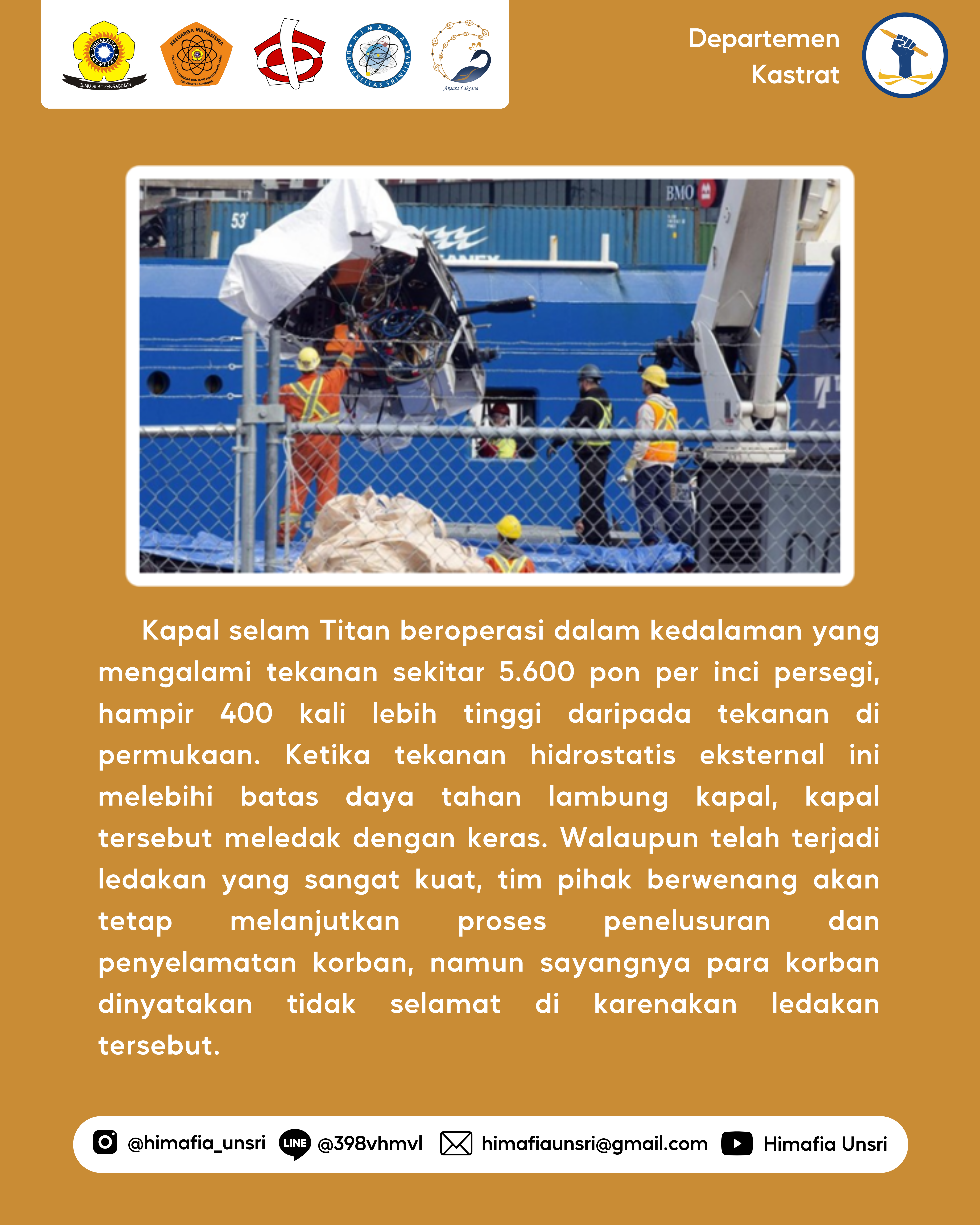 Kapal selam Titan beroperasi dalam kedalaman yang mengalami tekanan sekitar 5.600 pon per inci persegi, hampir 400 kali lebih tinggi daripada tekanan di permukaan. Ketika tekanan hidrostatis eksternal ini melebihi batas daya tahan lambung kapal, kapal tersebut meledak dengan keras. Walaupun telah terjadi ledakan yang sangat kuat, tim pihak berwenang akan tetap melanjutkan proses penelusuran dan penyelamatan korban, namun sayangnya para korban dinyatakan tidak selamat di karenakan ledakan tersebut