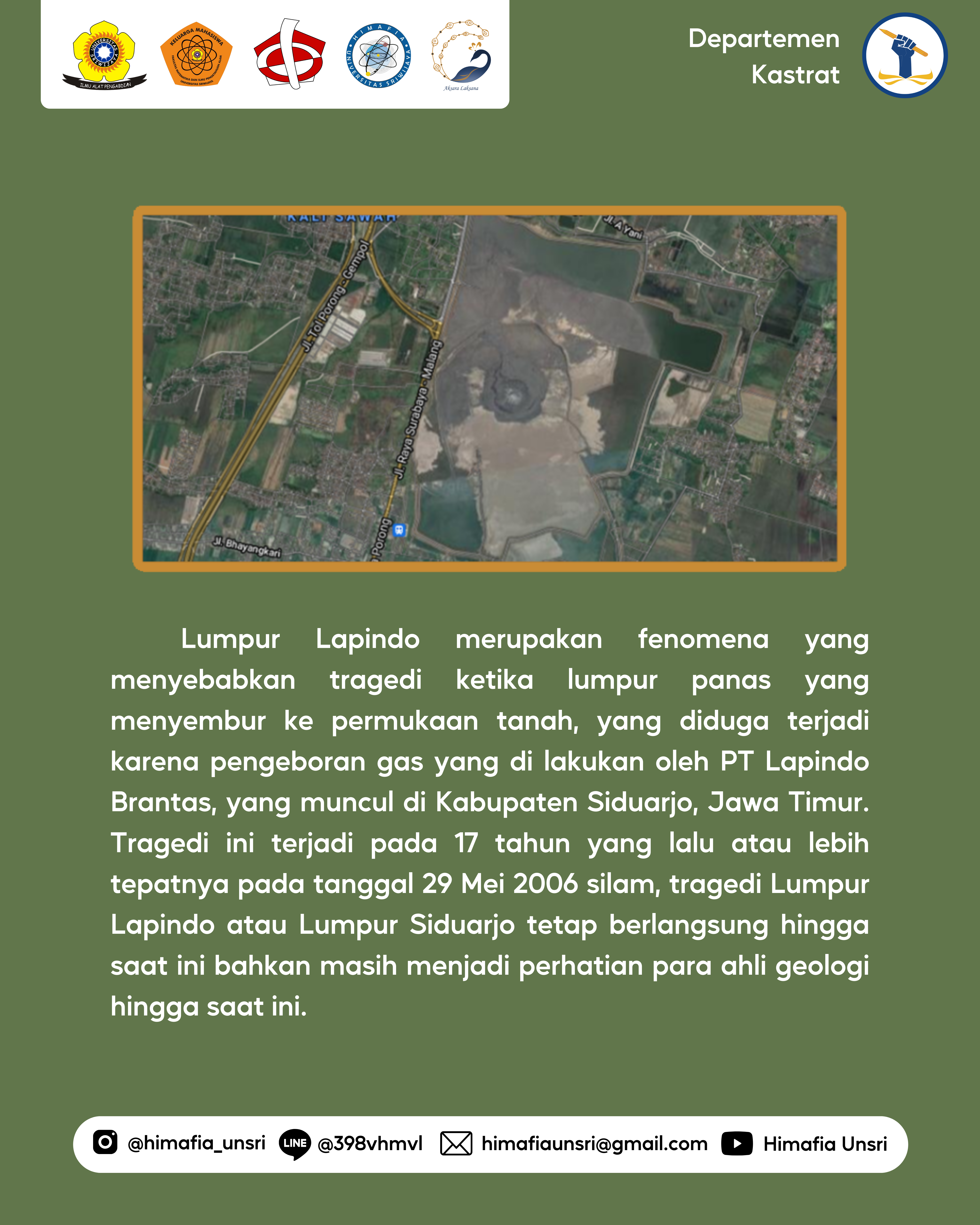 Lumpur Lapindo merupakan fenomena yang menyebabkan tragedi ketika lumpur panas yang menyembur ke permukaan tanah, yang diduga terjadi karena adanya pengeboran gas yang di lakukan oleh PT Lapindo Brantas, yang muncul di Kabupaten Siduarjo, Jawa Timur. Tragedi ini terjadi pada 17 tahun yang lalu atau lebih tepatnya pada tanggal 29 Mei 2006 silam, tragedi Lumpur Lapindo atau Lumpur Siduarjo masih tetap berlangsung hingga saat ini bahkan sampai saat ini masih menjadi pantauan para ahli geologi.