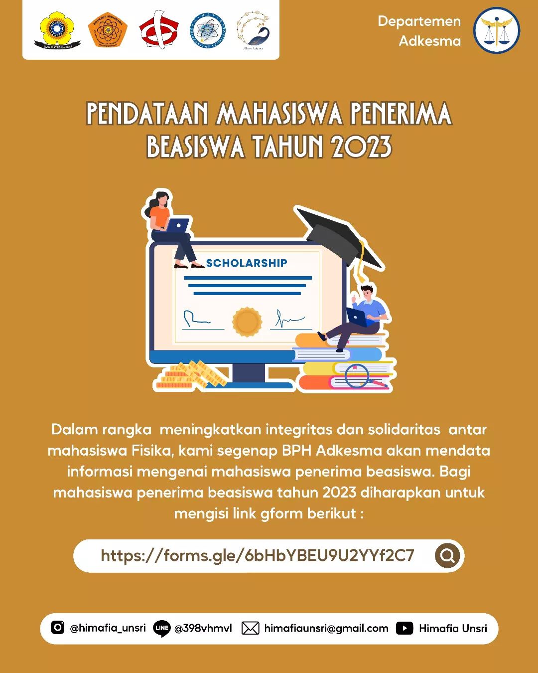 Dalam rangka meningkatkan integritas dan solidaritas antar mahasiswa Fisika. Kami segenap BPH Adkesma akan mendata informasi mengenai mahasiswa penerima beasiswa. Mohon kerjasamanya untuk mengisi link gform yang sudah tertera dibawah, agar kami dapat memperbarui catatan mahasiswa penerima beasiswa dengan lebih akurat.